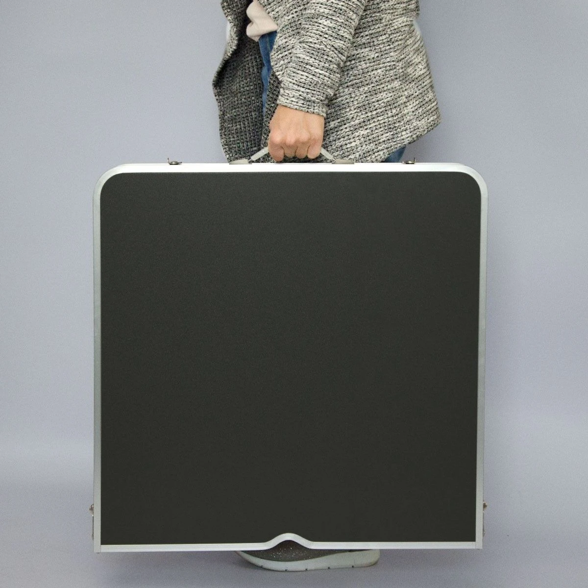 Met zijn inklapbaar tafelblad verandert de tafel in een lichte koffer – zelfs met een draaggreep.