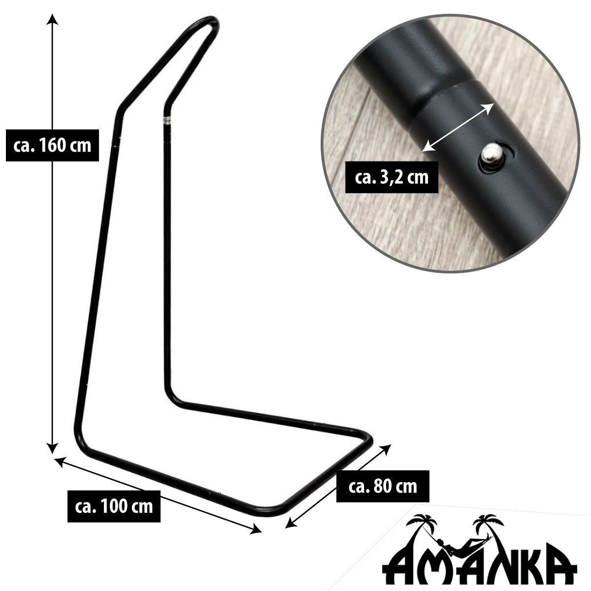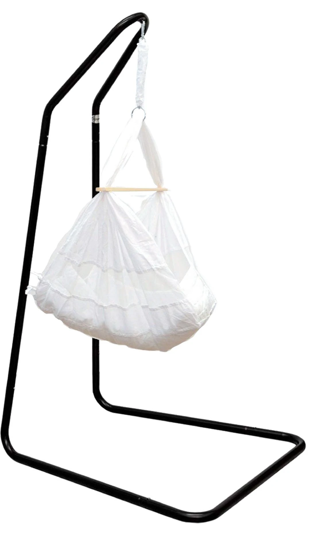 De standaard van sterk metaal in zwart is ca. 160 cm: Ideale hoogte voor babymand of hangwieg.