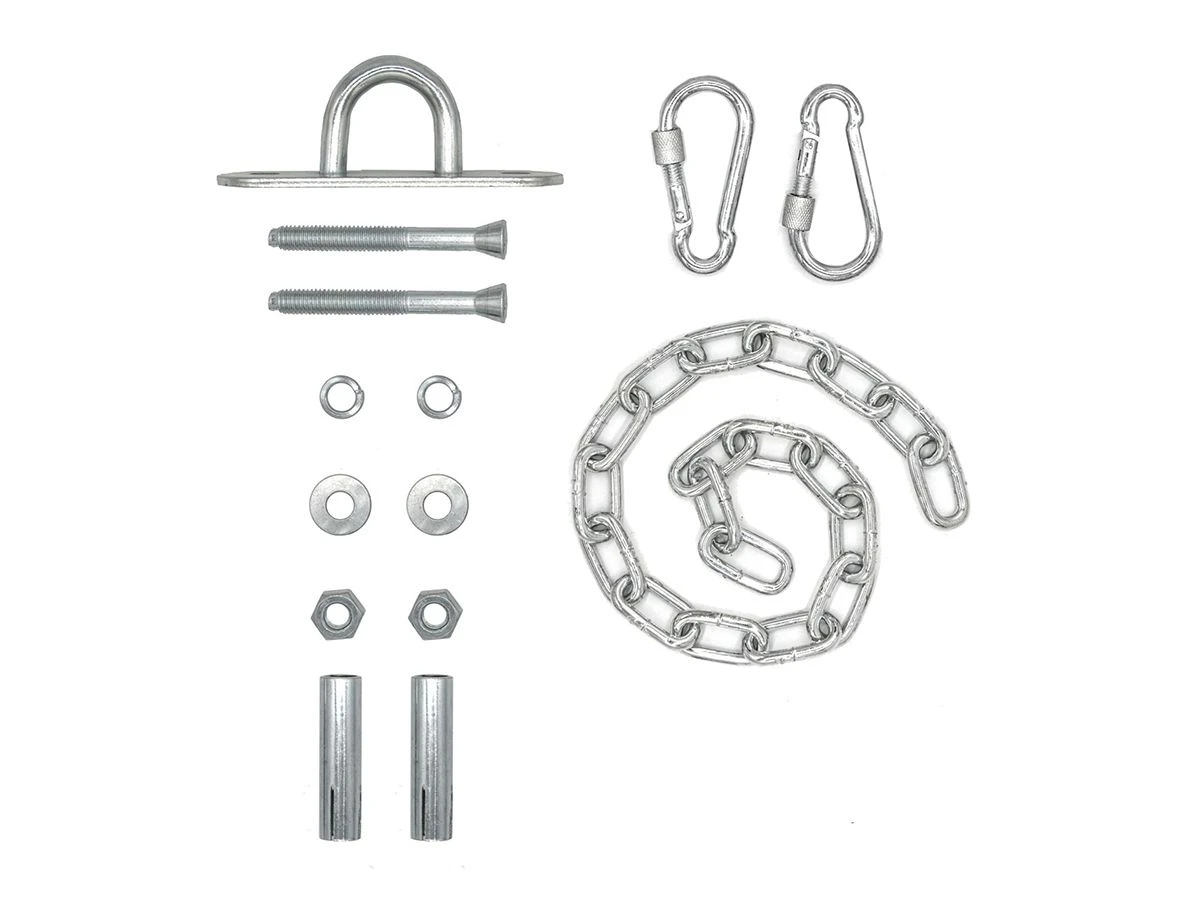 De 3 mm dikke ijzeren plaat wordt vastgehouden door twee betonnen ankers. De verlengketting van 50 cm zorgt voor de perfecte hoogte – schroefkarabijnhaken voor een veilige grip.
