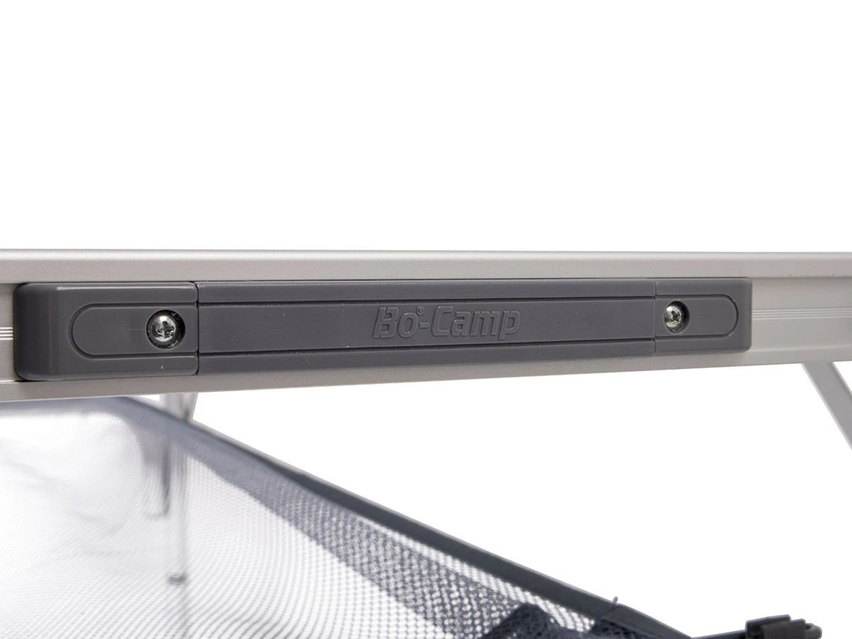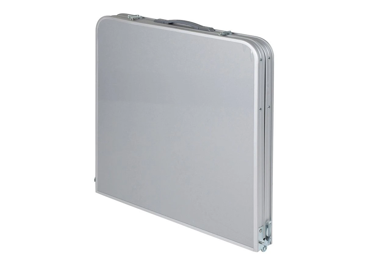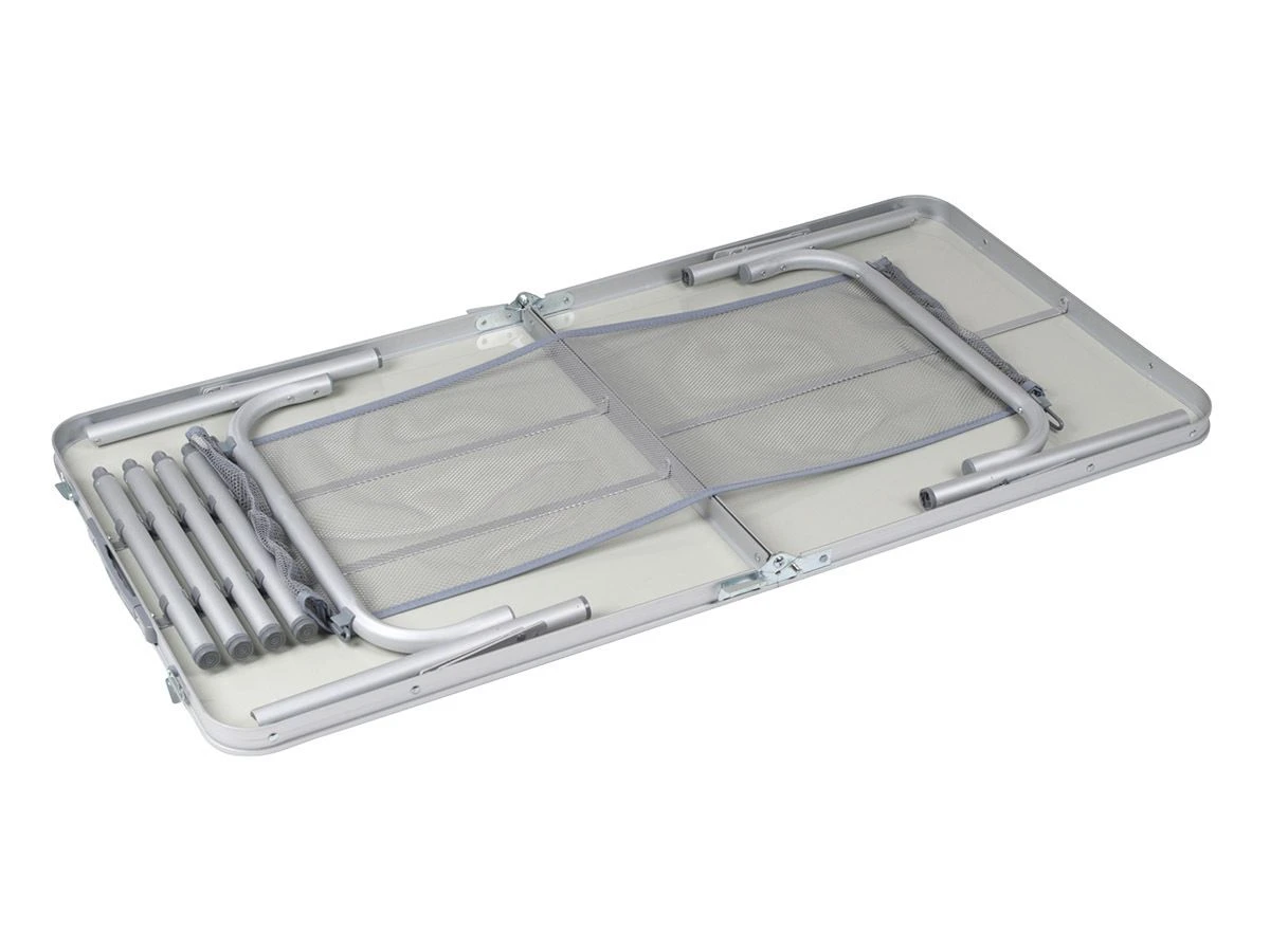 Deze aluminium tafel van Bo-Camp kun je eenvoudig mee nemen doordat hij is in te klappen tot een handig koffermodel. De tafel heeft uitgeklapt een afmeting van 120 x 60 cm en is verstelbaar in twee verschillende hoogtes, 36 en 70 cm. Alle vier de poten zijn voorzien van stelschroeven voor de fijnafstelling. Onder het blad zit een handig lectuurnet zodat je altijd je boek of tijdschrift in de buurt hebt.
