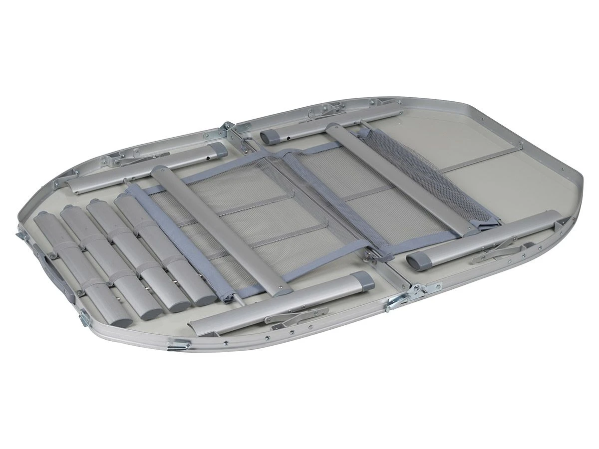 Onder het blad zit een handig lectuurnet zodat je altijd je boek of tijdschrift in de buurt hebt. Na gebruik is de tafel compact op te vouwen, door het deelbare blad kun je de tafel inklappen als een koffer.