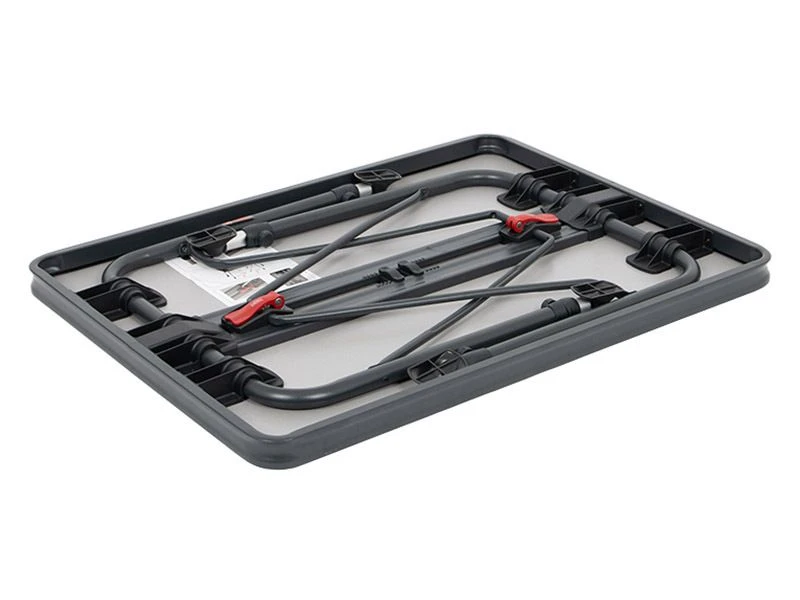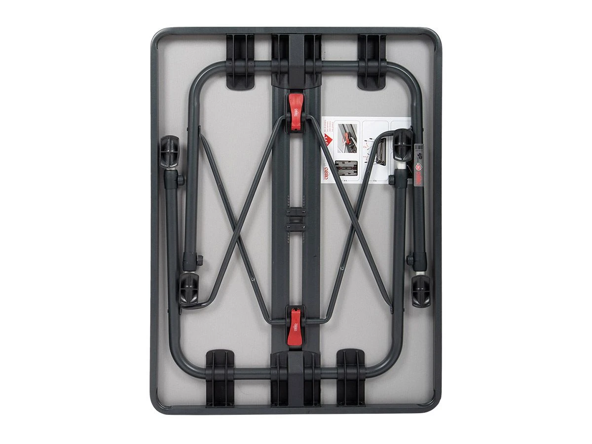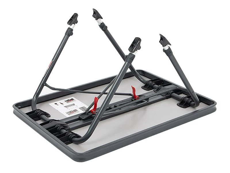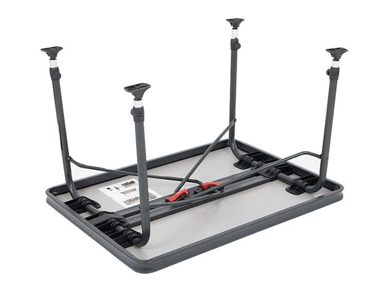 Het tafelblad heeft een afmeting van 80 x 60 cm en beschikt over traploos verstelbare poten (van 48 cm tot 74 cm). Deze poten zijn voorzien van een uniek in- en uit-klap mechanisme waardoor deze heel eenvoudig is op te zetten en in te klappen.