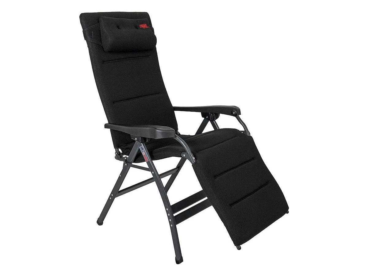 Een zeer luxe extra brede comfortabele ergonomische relaxstoel met hoofdkussen. Deze stoel biedt maximaal comfort doordat de stoel traploos verstelbaar is. Daarnaast is deze stoel voorzien van een gepolsterde 3D stof welke is bevestigd door middel van elastiek. De comfortabele vulling van deze stof is extra luchtdoorlatend en houdt geen vocht vast. Hierdoor is deze stoel sneller droog dan andere stoelen met een traditionele schuimvulling. Daarnaast zorgt de afwerking voor een stijlvolle uitstraling. Zowel de rugleuning als de armleggers zijn ergonomisch gevormd en de is stoel voorzien van een remsysteem om de stoel in iedere gewenste positie te fixeren. De stoel is voorzien van een geanodiseerd H-frame voor extra stabiliteit en stevigheid. De stoel heeft een extra brede, een extra diepe en een extra hoge zit. Ingeklapt is deze stoel zeer compact en daardoor gemakkelijk mee te nemen in de meegeleverde opbergtas.