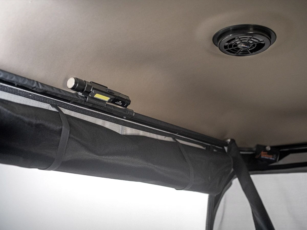 Verder is de daktent voorzien van een aantal handigheidjes die het kamperen makkelijk makkelijker en comfortabeler maken. De Odyssey wordt standaard geleverd met een oplaadbare ledlamp die ook als zaklamp gebruikt kan worden. Het dak is voorzien van een geïntegreerde ventilator die werkt op zonne-energie die zorgt voor een aangenaam leefklimaat. Verder is er een handig bagagenet aan het plafond gespannen voor het opbergen van bagage.