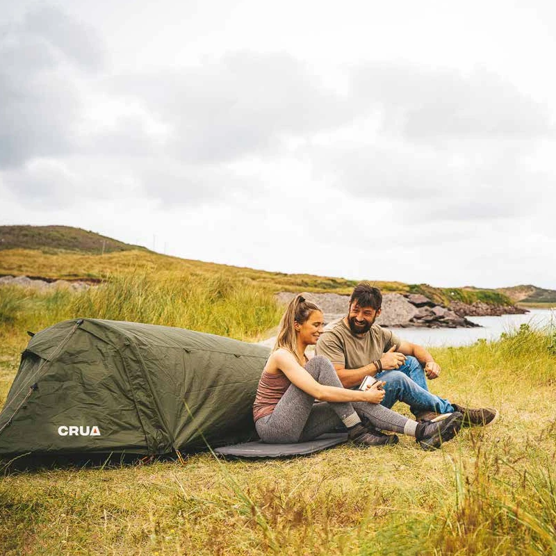 Let op de Crua Twin Hybrid mag in de hangmatmodus niet worden gebruikt zonder de horizontale spreidstok, anders kan de hangmat naar je toe klappen. De boogstokken zijn alleen om de buitentent en het insectengaas te ondersteunen, niet om de vloer te spreiden.