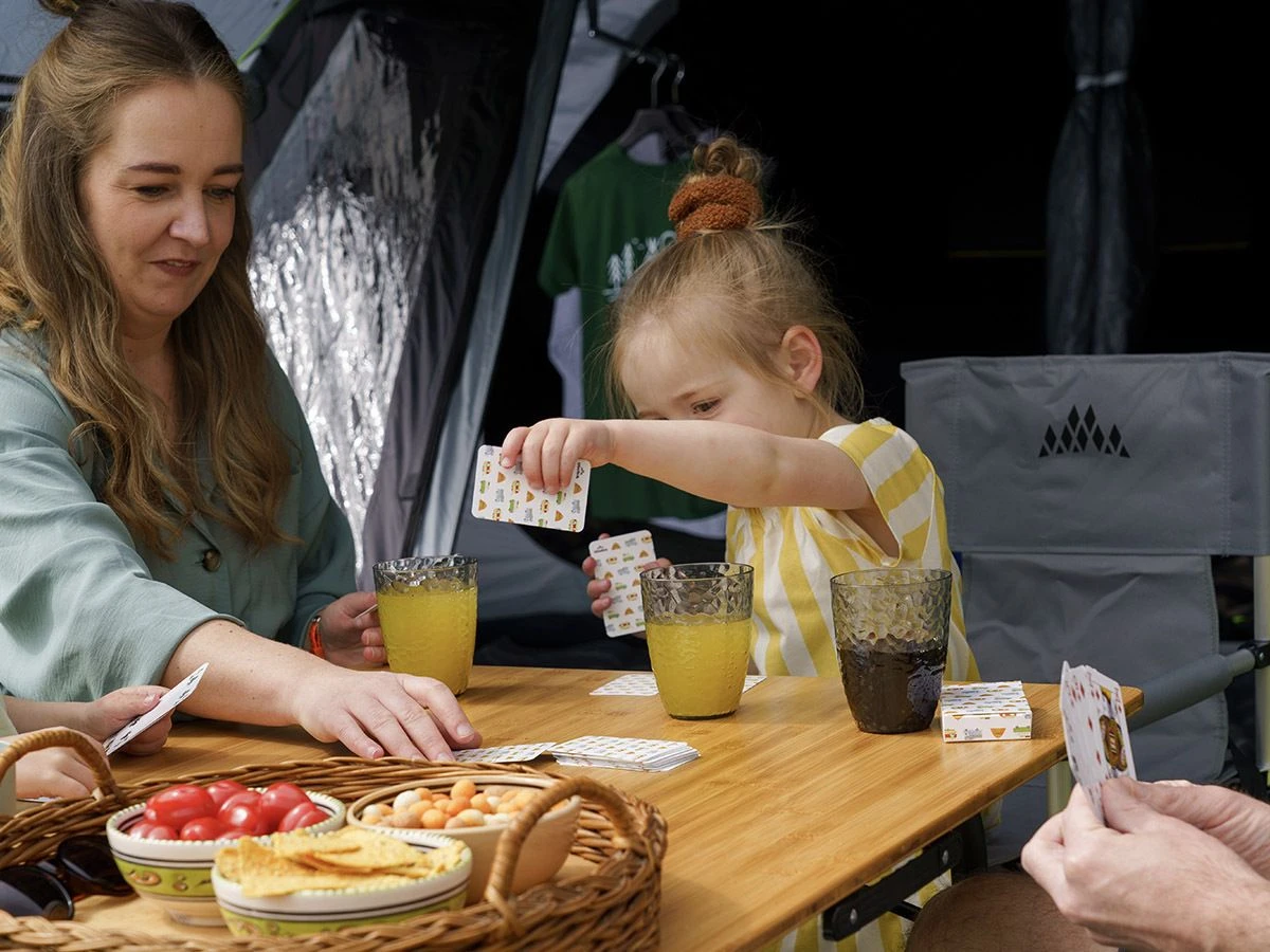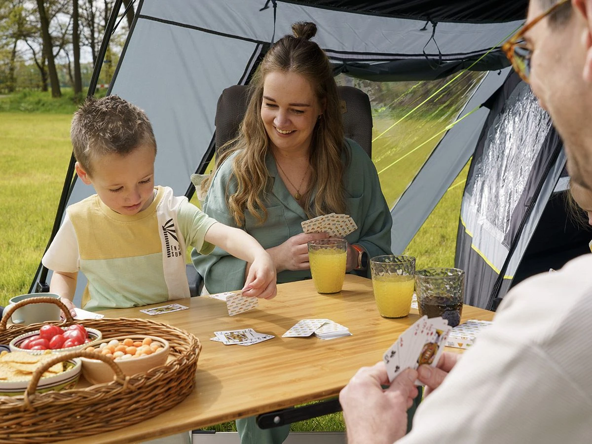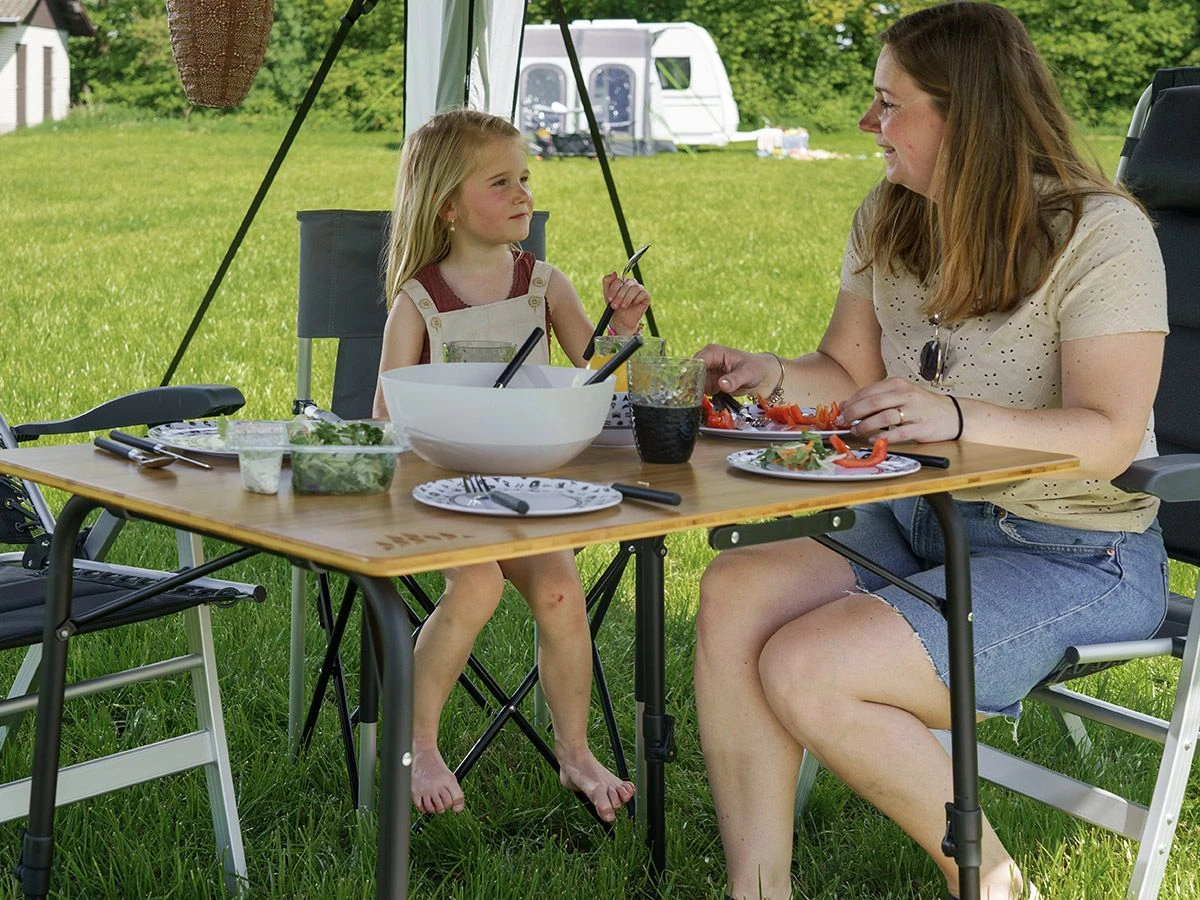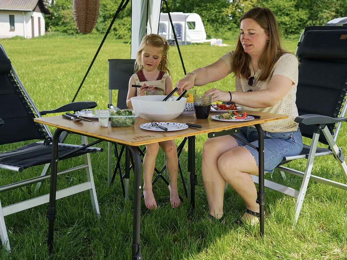 Het frame is gemaakt van lichtgewicht aluminium en het bamboe blad kan wel tegen een onverwachte regenbui. Aan de tafel zit een handvat verwerkt zodat je hem eenvoudig kunt optillen.