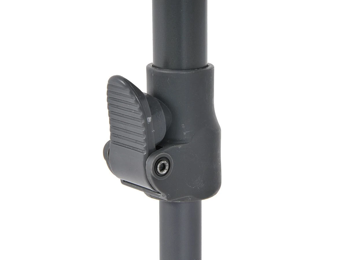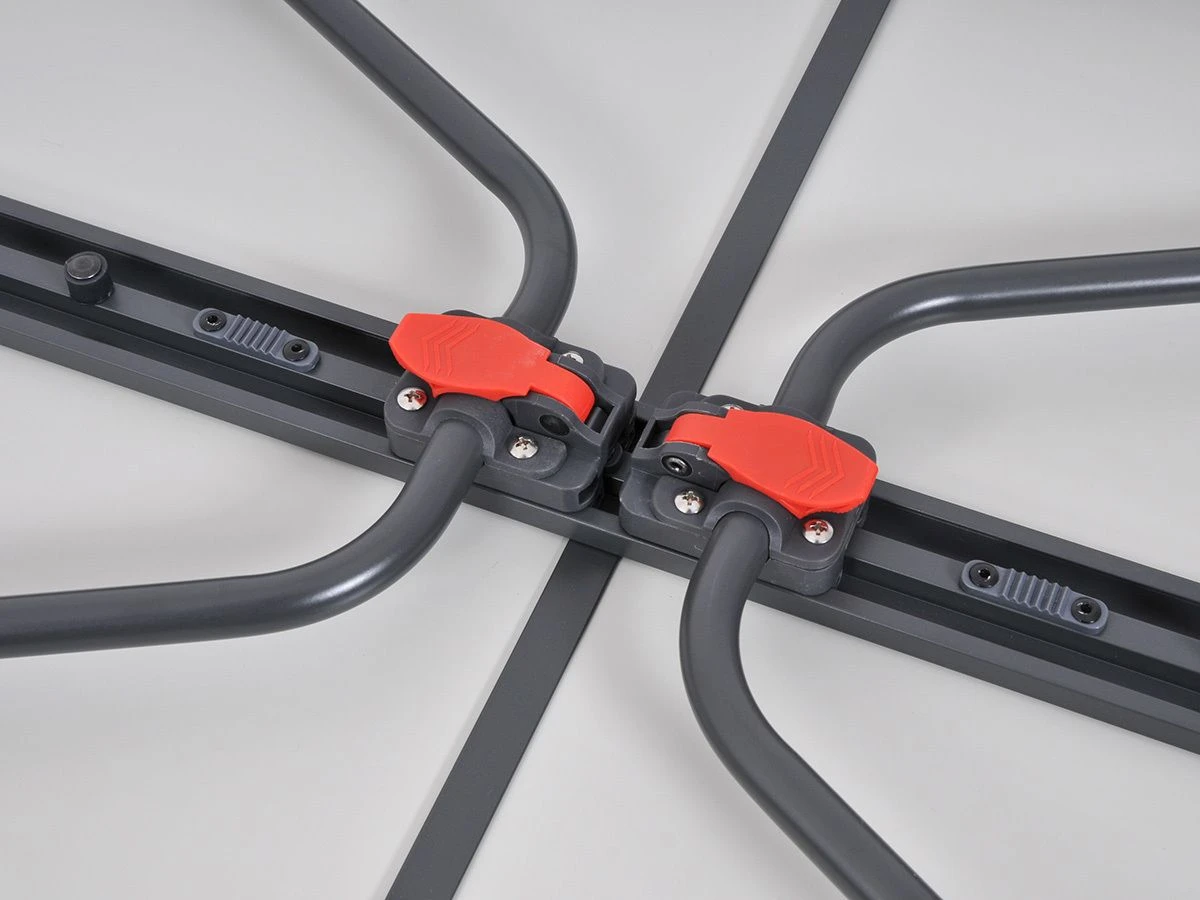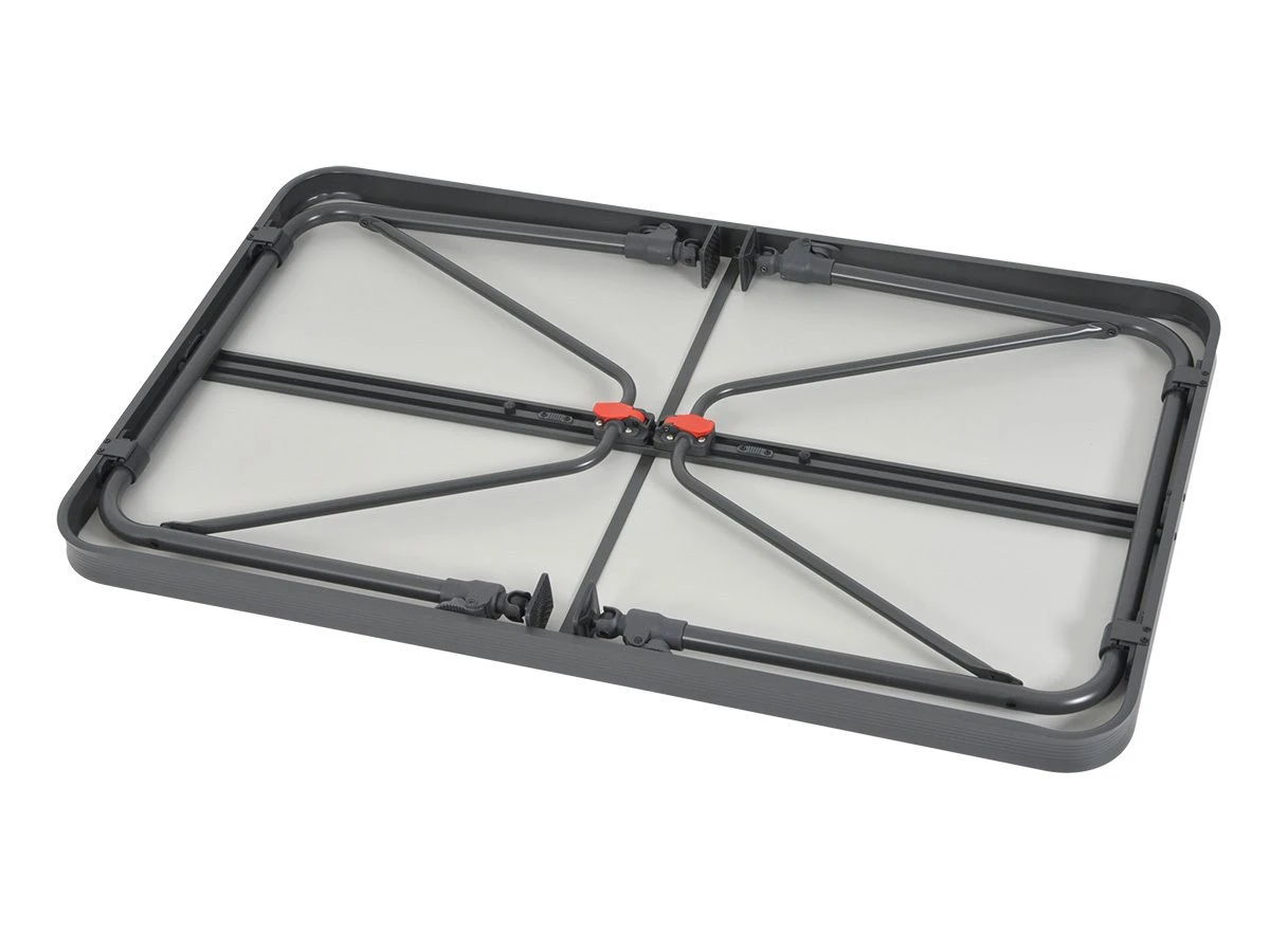 Het frame is gemaakt van lichtgewicht aluminium. Daarnaast vallen de poten tijdens het inklappen onder het tafelblad, waardoor deze niet zichtbaar zijn en de tafel makkelijker op te bergen is. De poten zijn voorzien van stelvoetjes waardoor de tafel op iedere ondergrond stabiel staat.