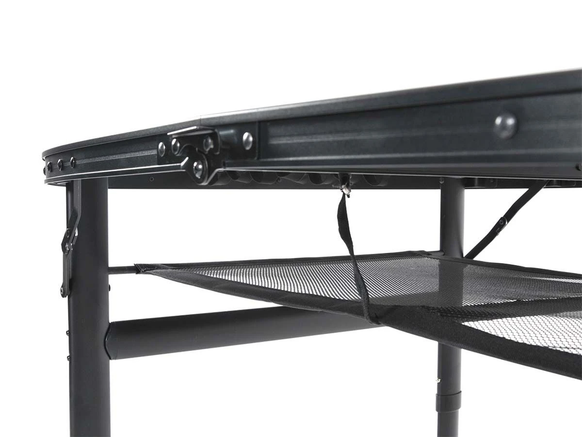 De tafel is in 2 hoogtes te verstellen en is voorzien van 4 handige stelvoetjes, zodat je de tafel overal waterpas neer kunt zetten. Het tafelblad is van MDF en afgewerkt met een aluminium rand. De tafel is dus NIET water- en hittebestendig.