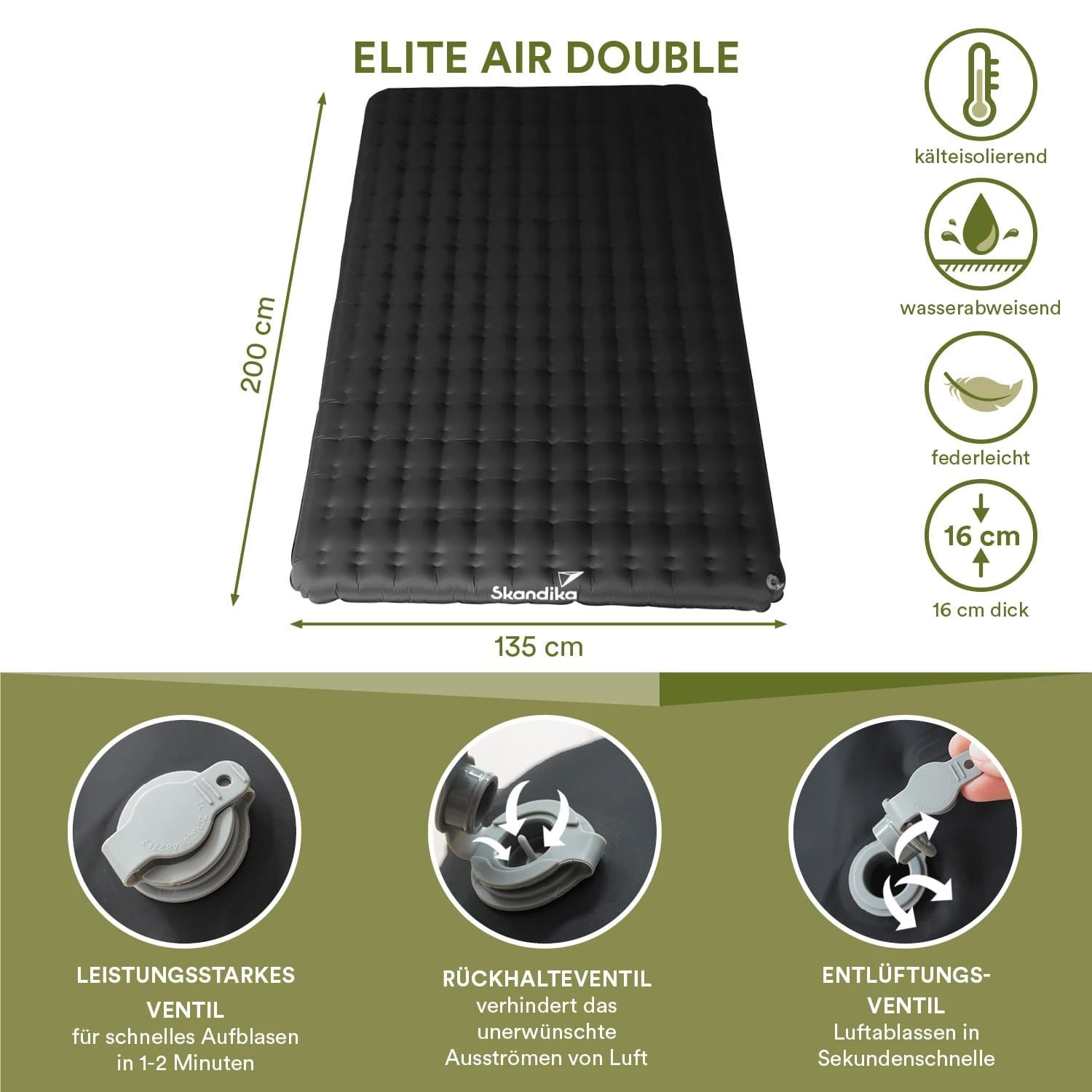 De slaapmat kan tot een hoogte van 16 cm worden opgeblazen en biedt daardoor een bijzonder aangenaam ligcomfort en de beste isolatie en bescherming tegen kou, vuil en vocht.