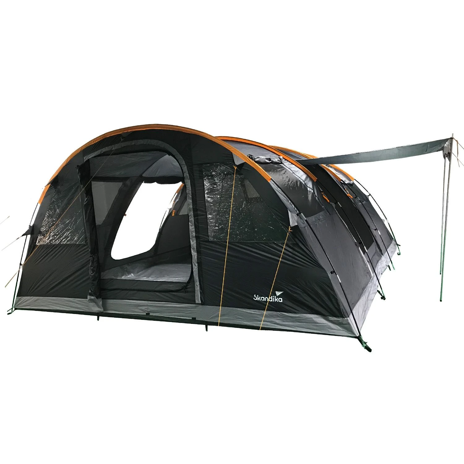 Grote familietent met veel functionele extra’s zoals lampophanging, kabelopening, ventilatieopeningen en een ingang die als zonneluifel kan worden gebruikt.