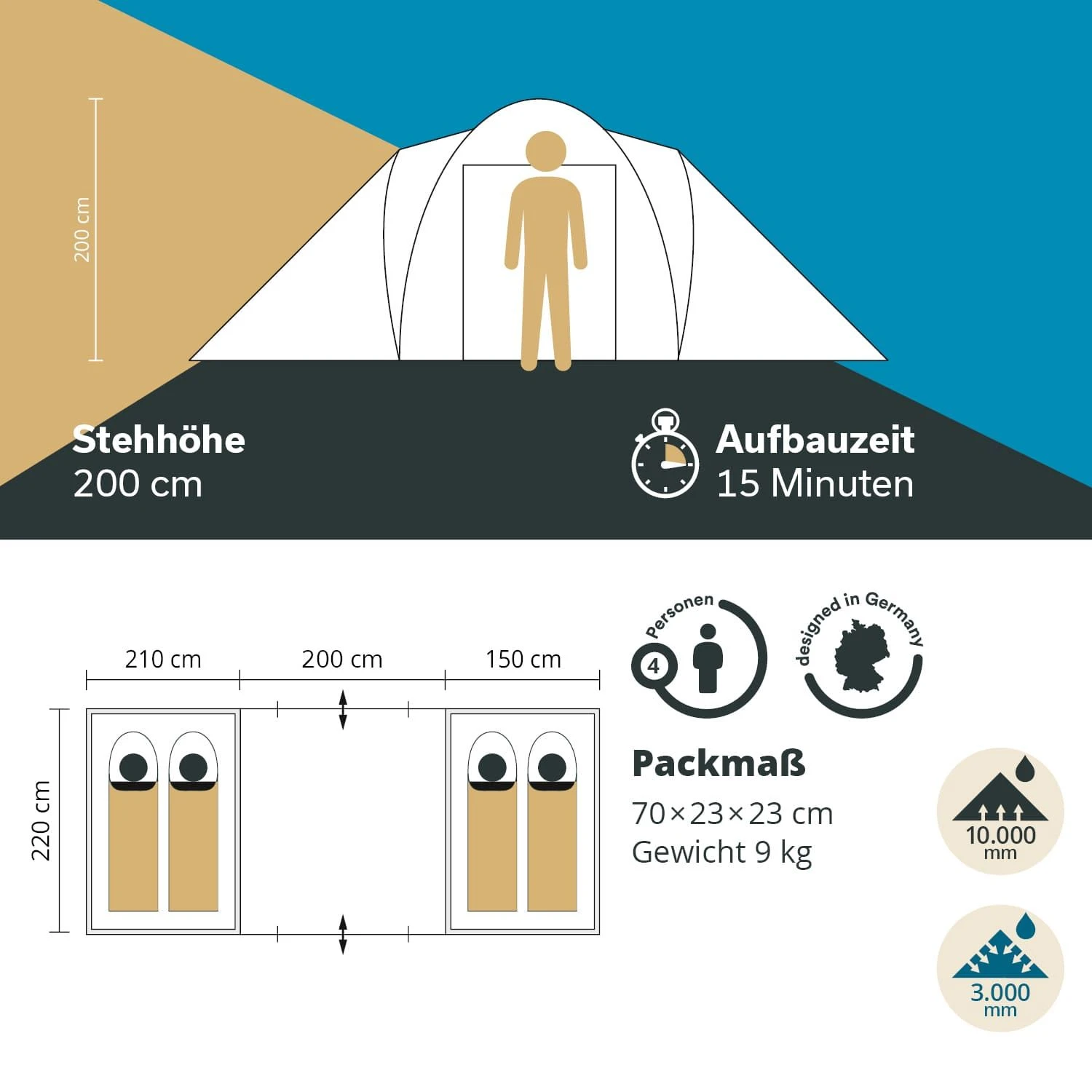 De grote slaapcabines bieden elk voldoende ruimte voor 2 personen en hebben ook muskietengaas bij de ingangen voor bescherming tegen insecten en zijn qua kleur afgestemd op de tent. De binnencabines kunnen naar wens flexibel aan- en losgekoppeld worden, zodat je eenvoudig de grootte van de leefruimte kunt variëren.