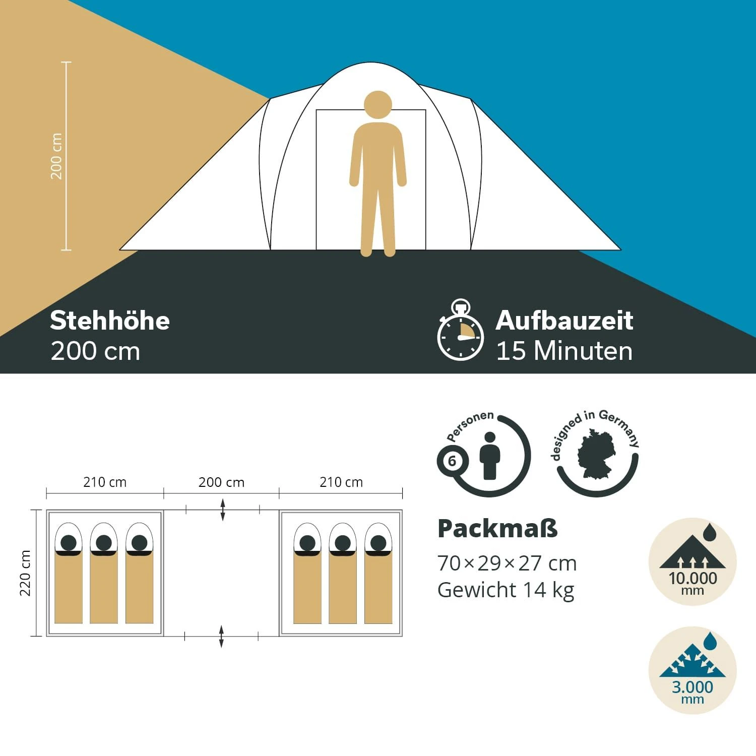 De grote slaapcabines bieden elk voldoende ruimte voor 2 personen en hebben ook muskietengaas bij de ingangen voor bescherming tegen insecten en zijn qua kleur afgestemd op de tent. De binnencabines kunnen naar wens flexibel aan- en losgekoppeld worden, zodat je eenvoudig de grootte van de leefruimte kunt variëren.