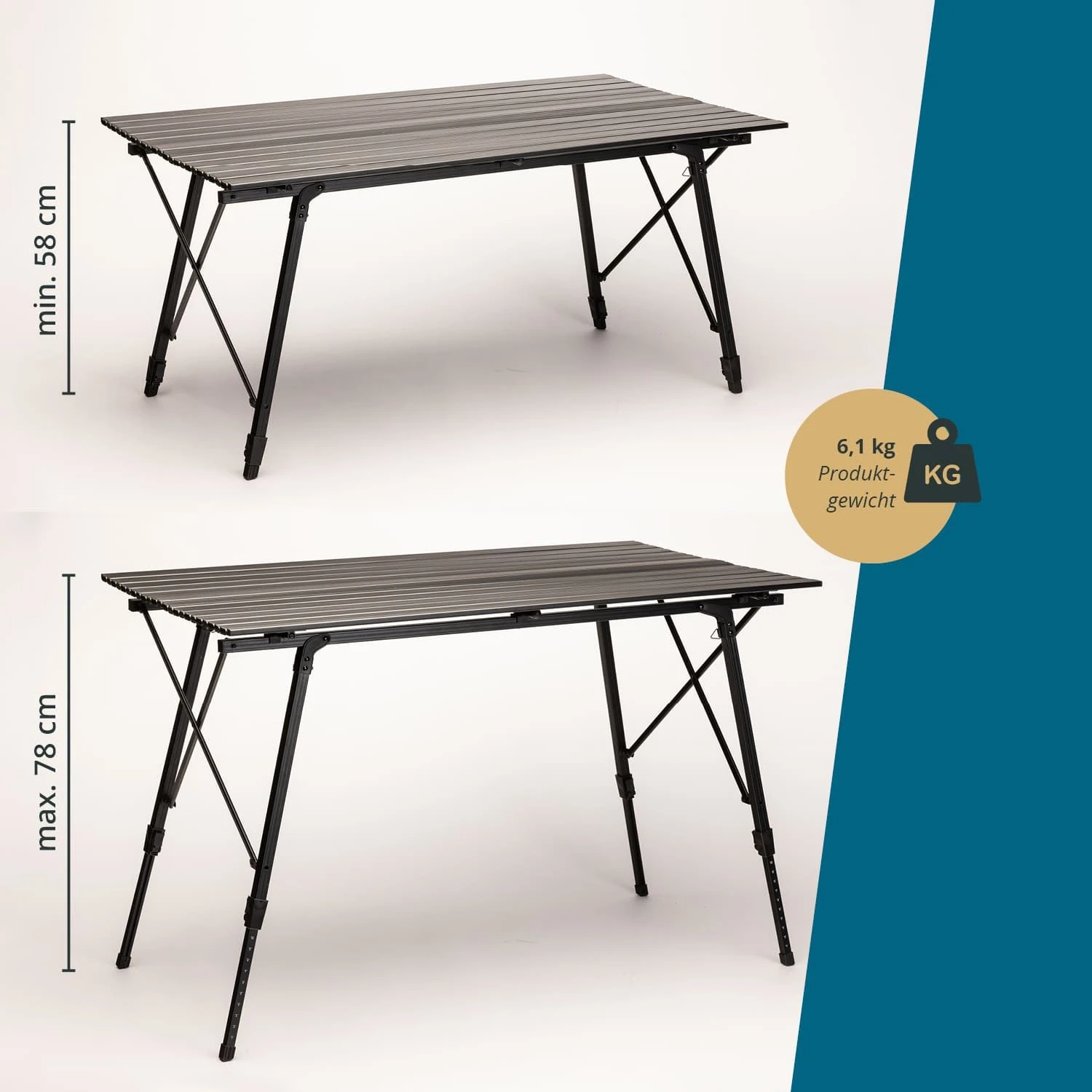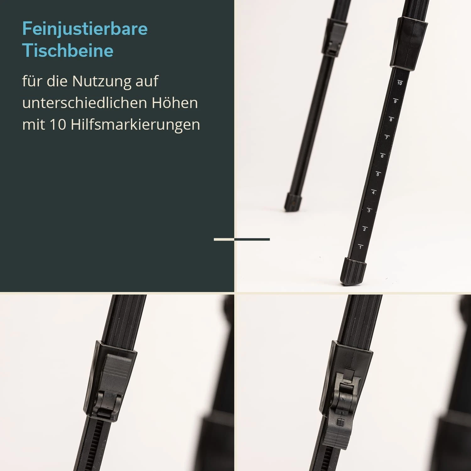 De tafelpoten zijn fijn verstelbaar en maken het mogelijk de tafel comfortabel te gebruiken op verschillende hoogtes tussen 58 – 78 cm, met 10 slimme markeringen om alle poten op dezelfde lengte te brengen.