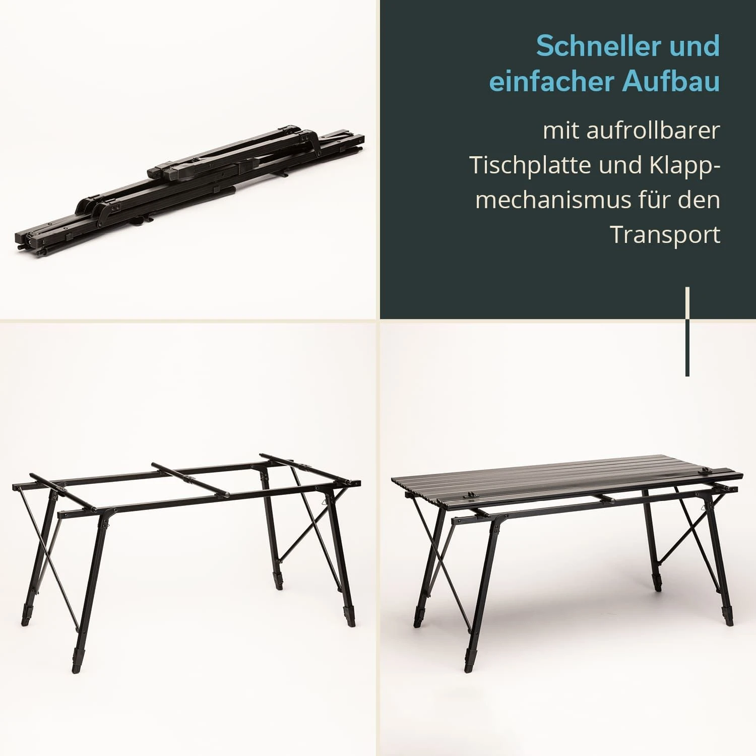 * Klaptafel van aluminium met roll-top tafelblad in elegant mat zwart.