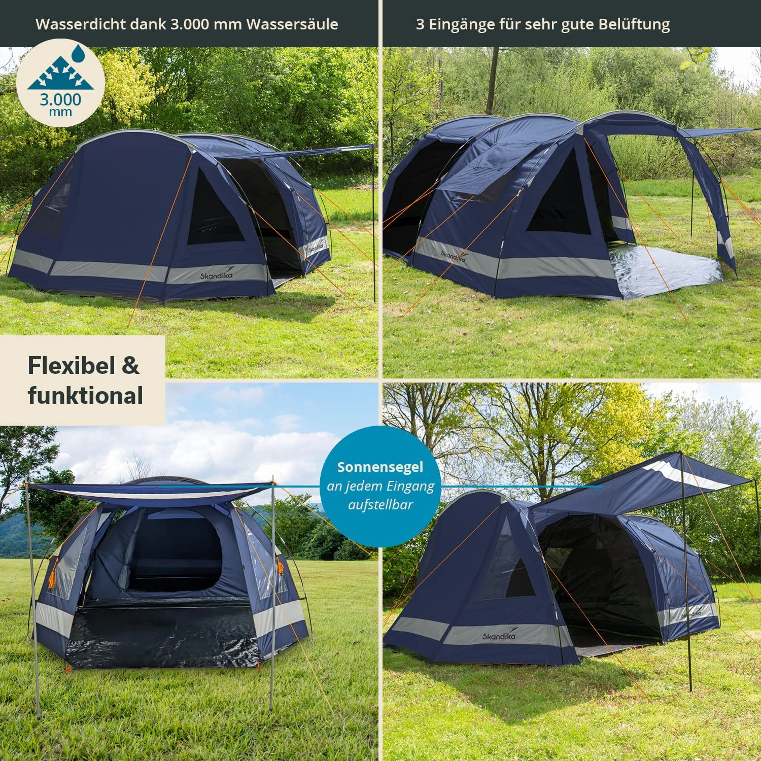 Nieuw is de zilverkleurige coating op de buitentent in de slaapcabine. Hoewel deze coating niet in de buurt komt van het verduisterende effect van de Skandika Sleeper technologie, draagt hij toch bij aan een merkbaar verduisterend effect en zorgt zo voor een rustiger nachtrust. De vestibule is ideaal voor het creëren van een leefruimte met ruimte voor bagage en kampeermeubilair zoals een tafel en stoelen. Dit is een harmonieuze plek om samen te komen voor een maaltijd of om plannen te maken voor de volgende dag. De slaapcabine heeft een eigen vast ingenaaid grondzeil en voor het woongedeelte wordt een apart grondzeil meegeleverd. Dit geeft je veel ruimte voor een persoonlijke inrichting.
