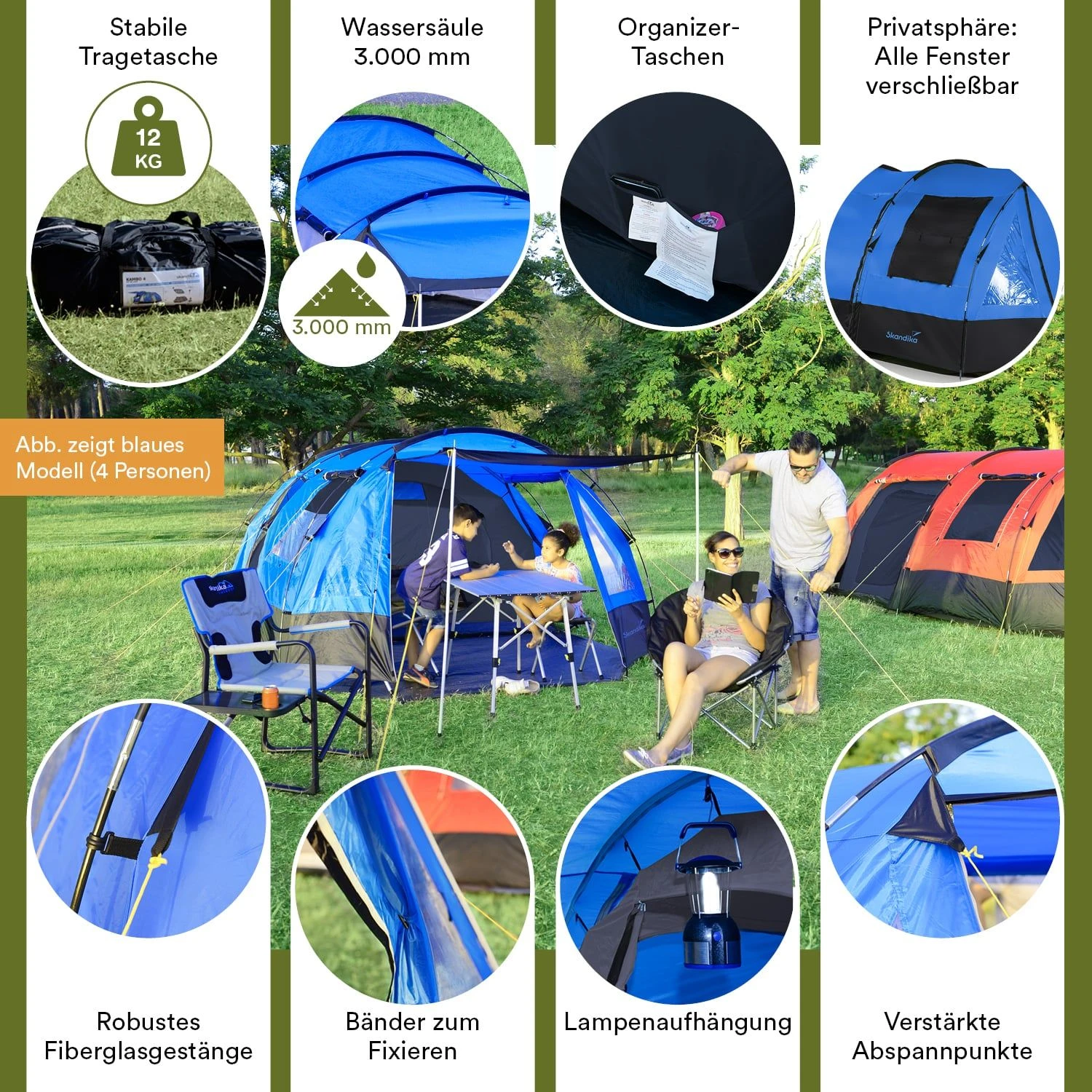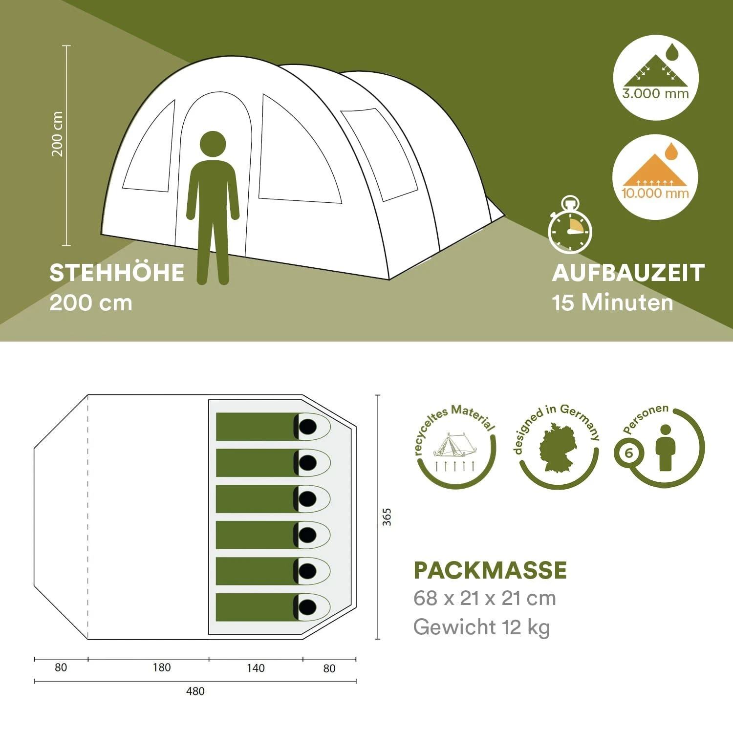 De SKANDIKA Kambo 6, genoemd naar een prachtige fjordoever in Noorwegen waar de idyllische bossen en weiden groen zijn, is een compacte tent voor maximaal zes personen.