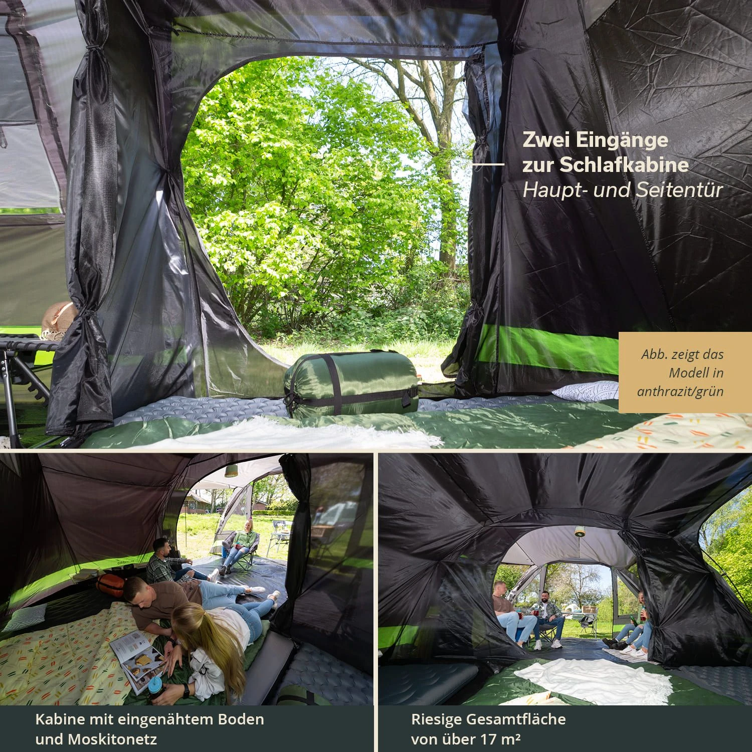 In totaal drie ingangen en meerdere ramen zorgen altijd voor de beste lichtomstandigheden en een aangenaam binnenklimaat dankzij voldoende ventilatiemogelijkheden. De onderste helft van het grote zijraam is gemaakt van transparante folie en de bovenste helft van muskietengaas, zodat luchtuitwisseling gegarandeerd is, zelfs als de deuren gesloten zijn. Natuurlijk kunnen alle ramen ook verduisterd worden. Alle drie de deuren kunnen worden opgerold en vastgezet of worden opgezet als luifel met behulp van de meegeleverde stalen stokken.