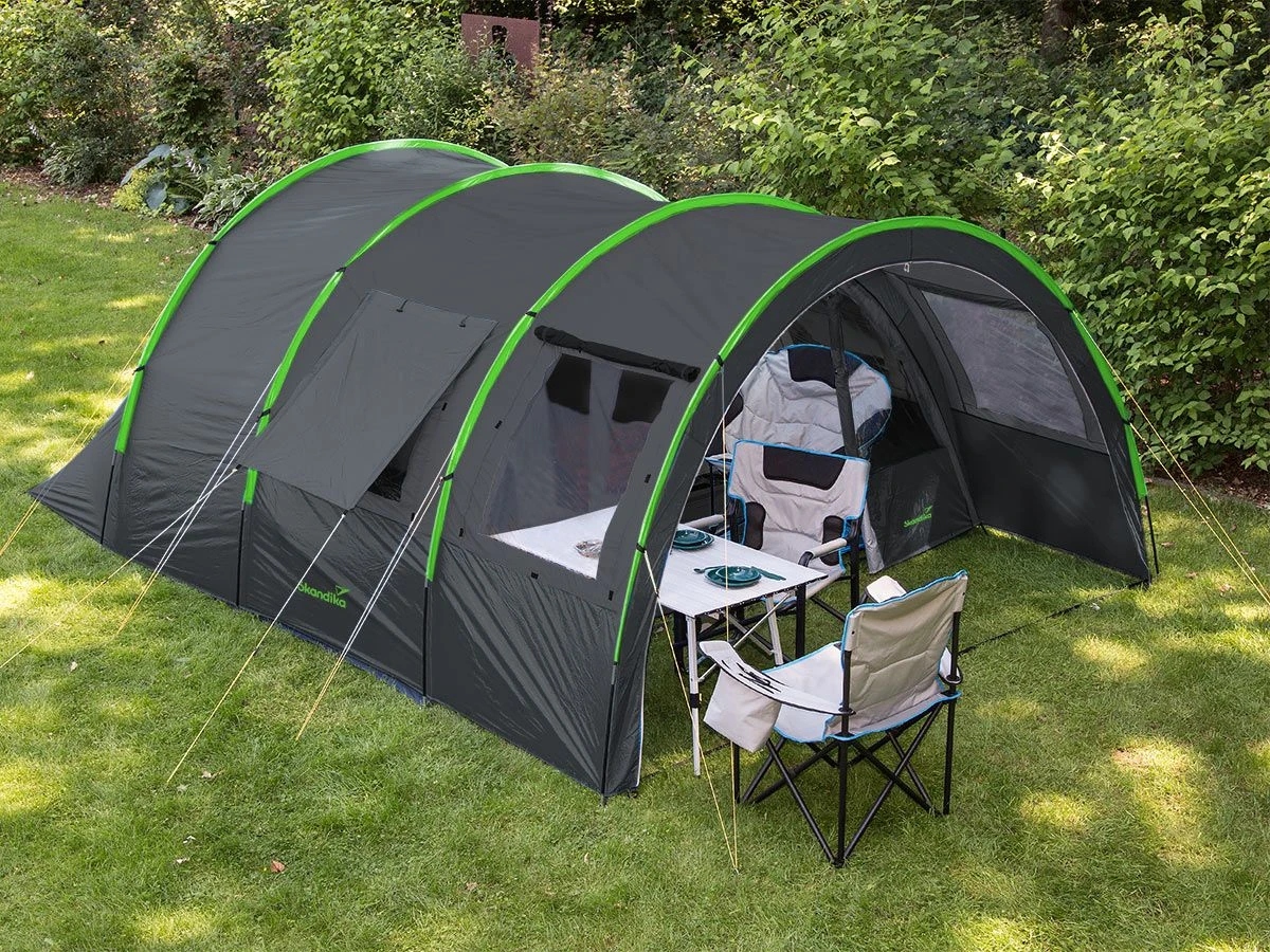 - ✔ VEEL RUIMTE: Ruime vierpersoons tunneltent voor families en vrienden met twee slaapcabines voor elk twee personen, elk met een eigen ingenaaide tentvloer en muskietennetten op de deuren. Een bijpassende tentvloer wordt geleverd voor het woongedeelte.
