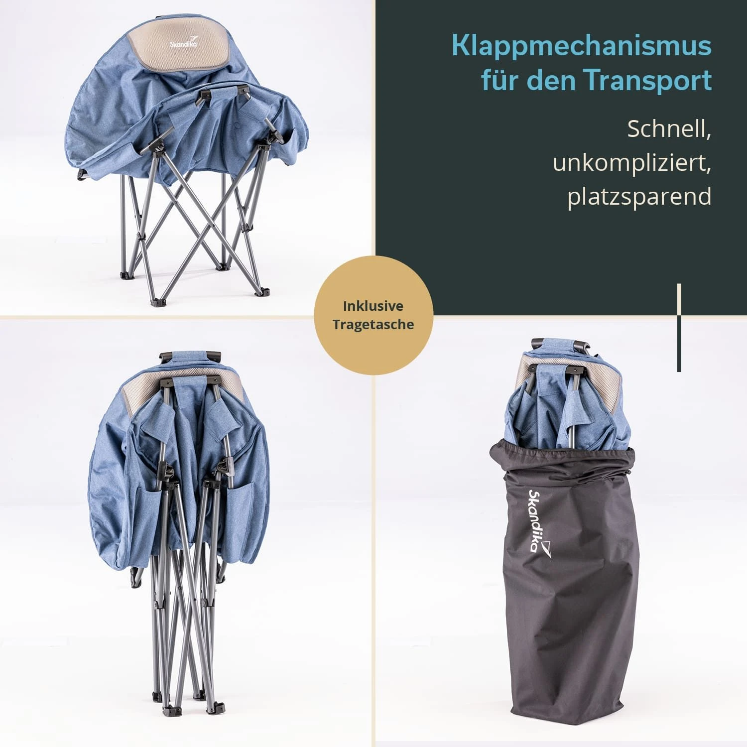 De bijzonder grote, ronde zitting van deze XL-campeerstoel is aangenaam zacht opgevuld en het slijtvaste materiaal is ook gemakkelijk schoon te maken – gewoon afnemen met een vochtige doek en de campingstoel ziet er weer fris uit.