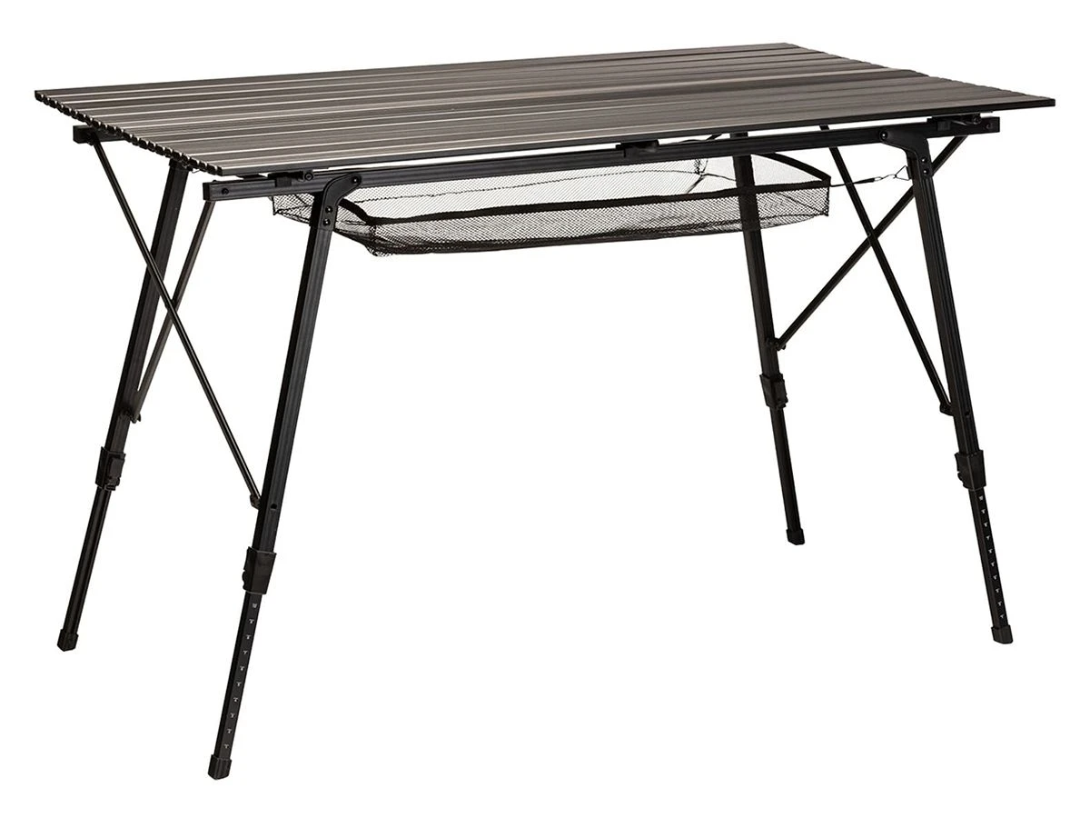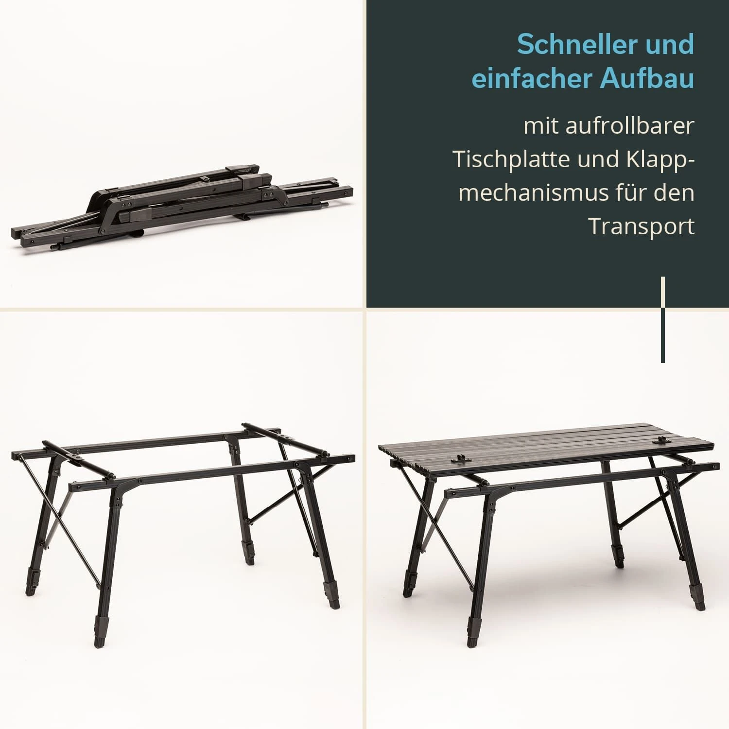 * Klaptafel van aluminium met roll-top tafelblad in elegant mat zwart.