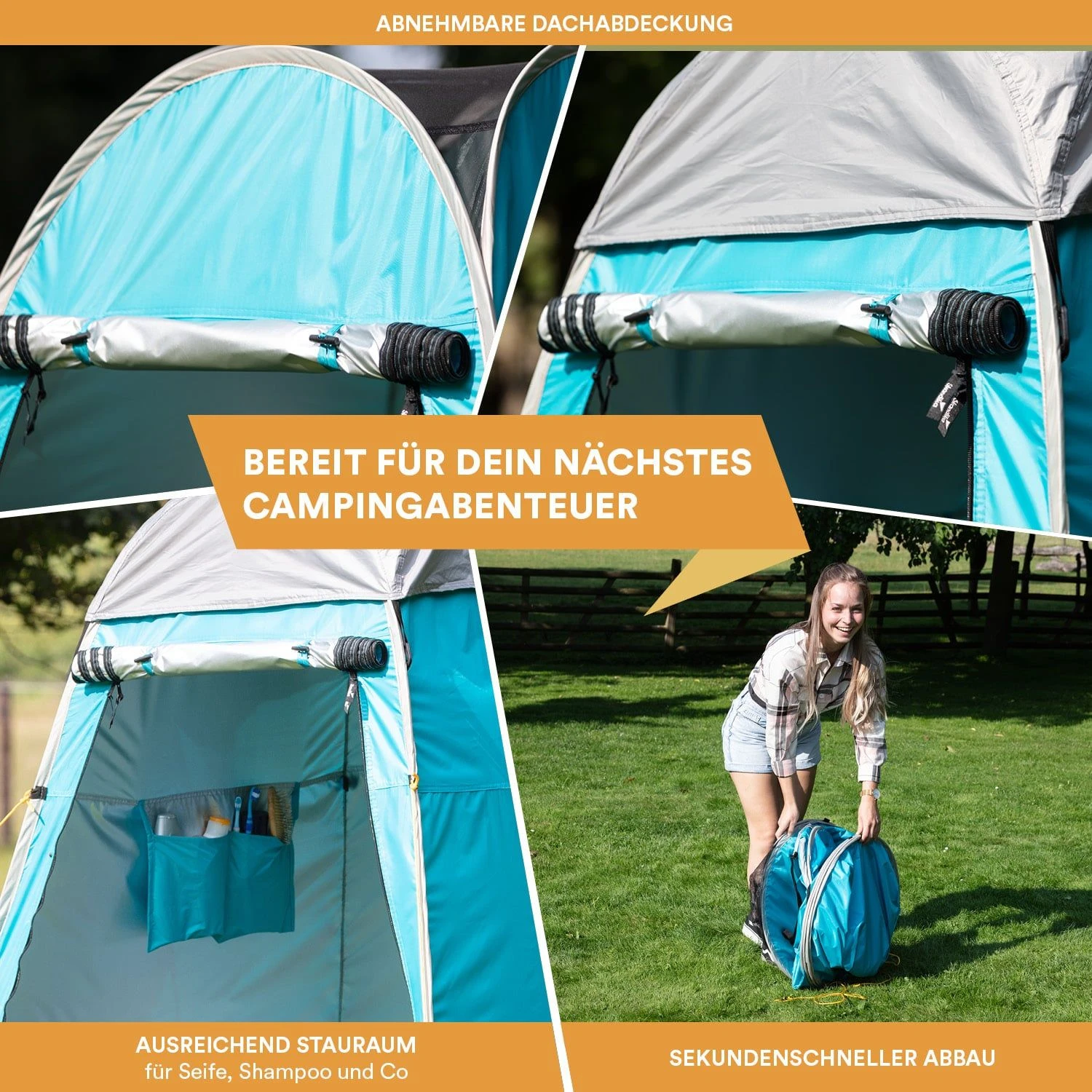 Het slijtvaste polyestermateriaal is aan de binnenzijde voorzien van een zilvercoating om te voorkomen dat de tentgebruiker voor schut komt te staan, zelfs wanneer de binnenzijde ’s nachts wordt verlicht. Voor bescherming van bovenaf kan de dakbedekking als optie worden gespannen. Als de campingdouche echter buiten de tent wordt opgehangen (b.v. aan een boom), kan het douchezeil gemakkelijk worden weggelaten en kunnen de slangen en de douchekop dan via het dak naar het tentinterieur worden geleid. De losse tentvloer maakt ook extra slanggeleiding van onderaf mogelijk.