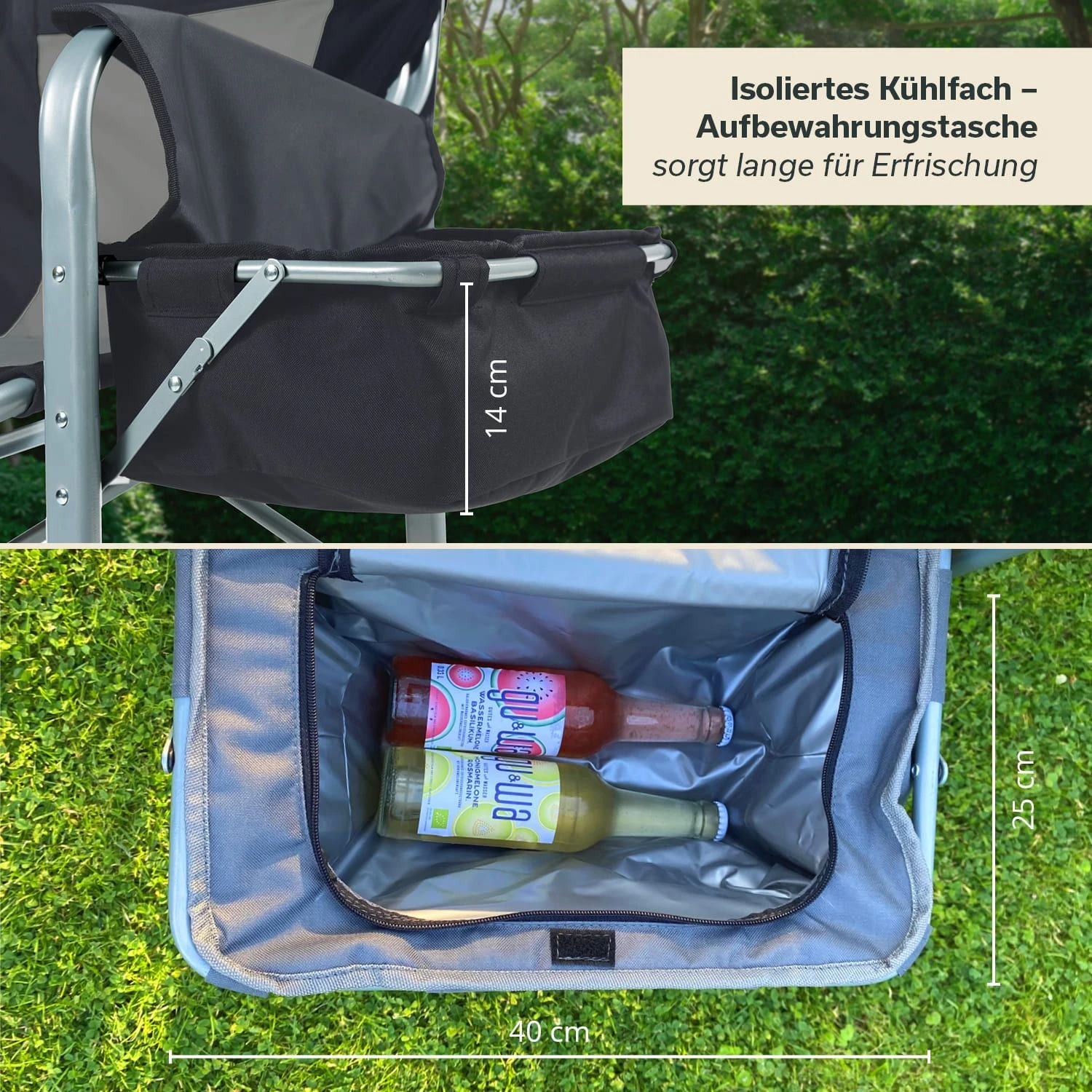 In de tweede armleuning bevindt zich een ruim koelvak met rits, dat bovendien beschermd wordt door een waterafstotende hoes. Je hoeft geen aparte koelbox meer mee te slepen – hier blijven je spullen veilig en koel waar je zit!