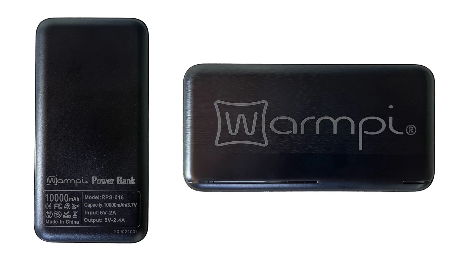 Inclusief: Warmpi® 10.000mAh powerbank + adapter + geïntegreerde USB-kabel (3m)